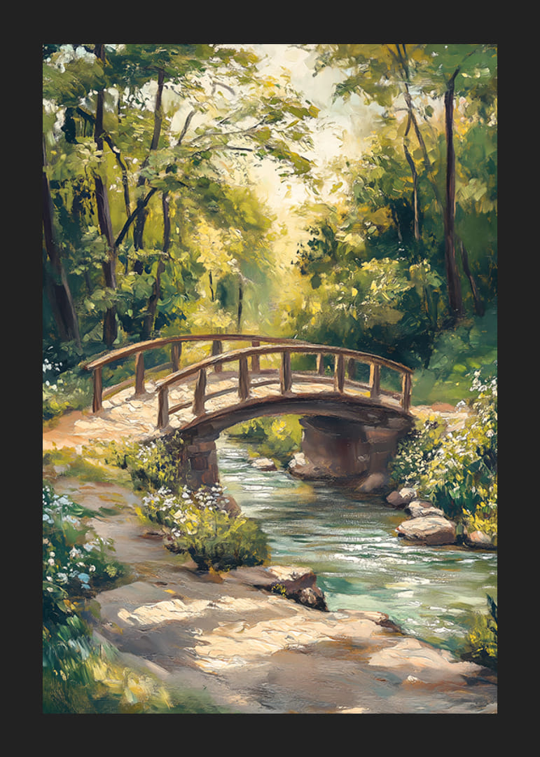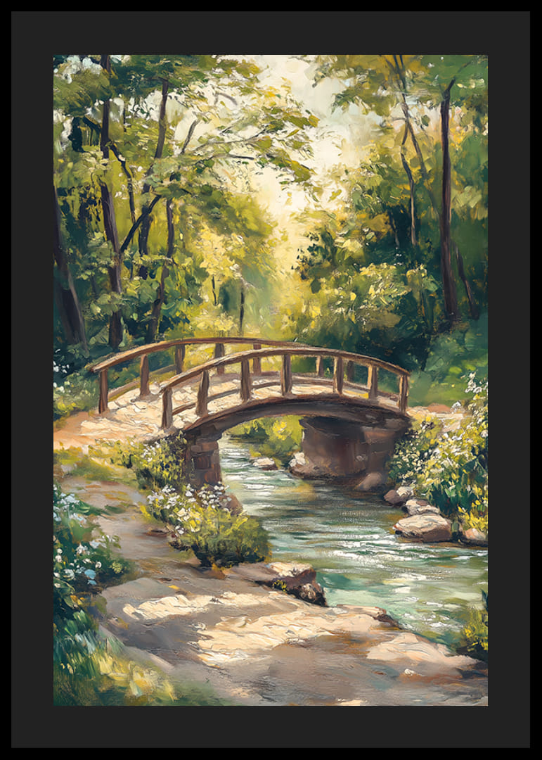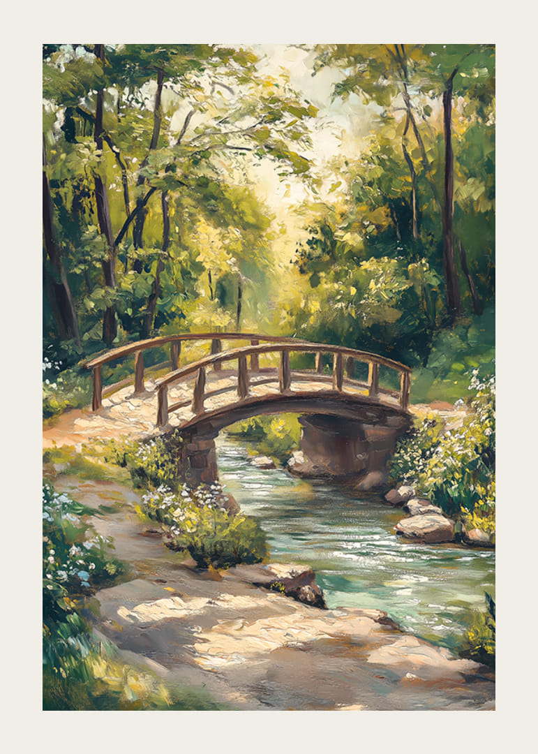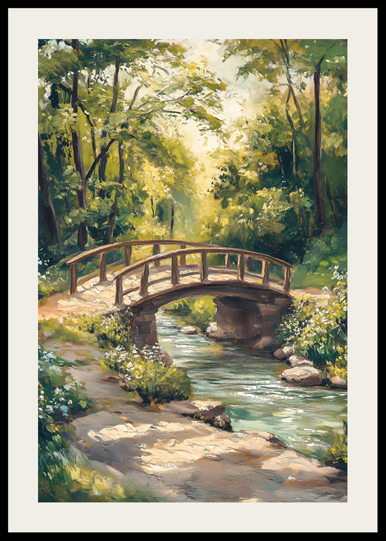 Landskab med en gammeldags træbro, der fører over en rislende bæk, indrammet af frodigt grønt og hvide blomster langs vandet. Sollys filtrerer blidt gennem trætoppene og reflekteres i det klare vand. Denne plakat giver et naturligt indtryk og er velegnet til rum, hvor ro og grønt ønskes.