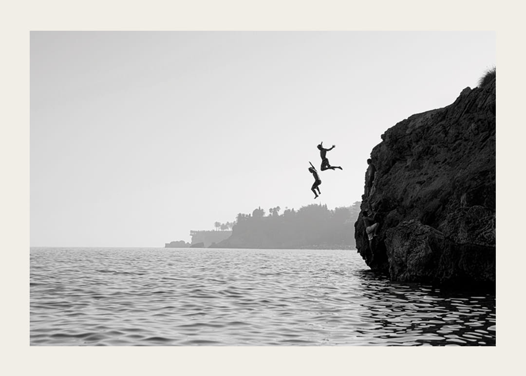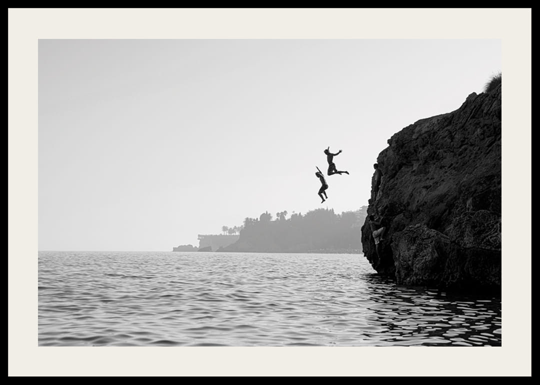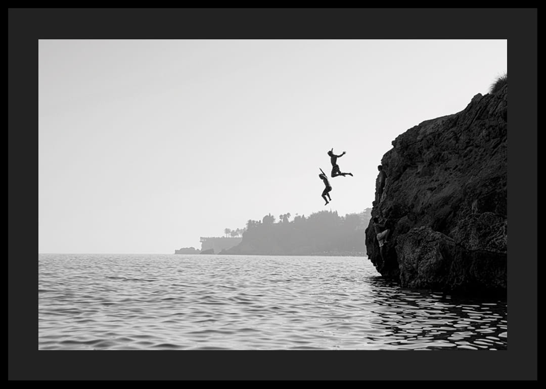 Denne sort-hvide plakat indfanger et øjeblik med ren frihed og eventyr – to mennesker, der modigt kaster sig ud fra en klippe i havet. Billedet formidler følelsen af ​​ungdommelig livsglæde, spænding og øjeblikkets magi. Med sin stilfulde sort-hvide tone bliver motivet en tidløs indretningsdetalje, der både inspirerer og vækker følelser. Perfekt til dem, der elsker rejser, frihed og minder om sommereventyr.