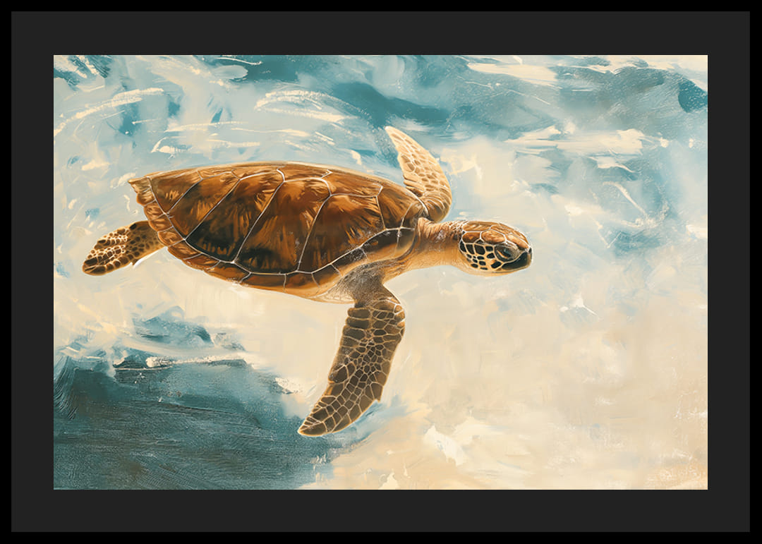 Lad denne smukke plakat bringe havets ro ind i dit hjem. Med bløde penselstrøg og harmoniske farver fanges den majestætiske havskildpaddes rolige bevægelse gennem det klare vand. Et symbol på visdom, frihed og evig rejse – perfekt til dem, der ønsker at skabe en beroligende og inspirerende atmosfære i dit værelse.