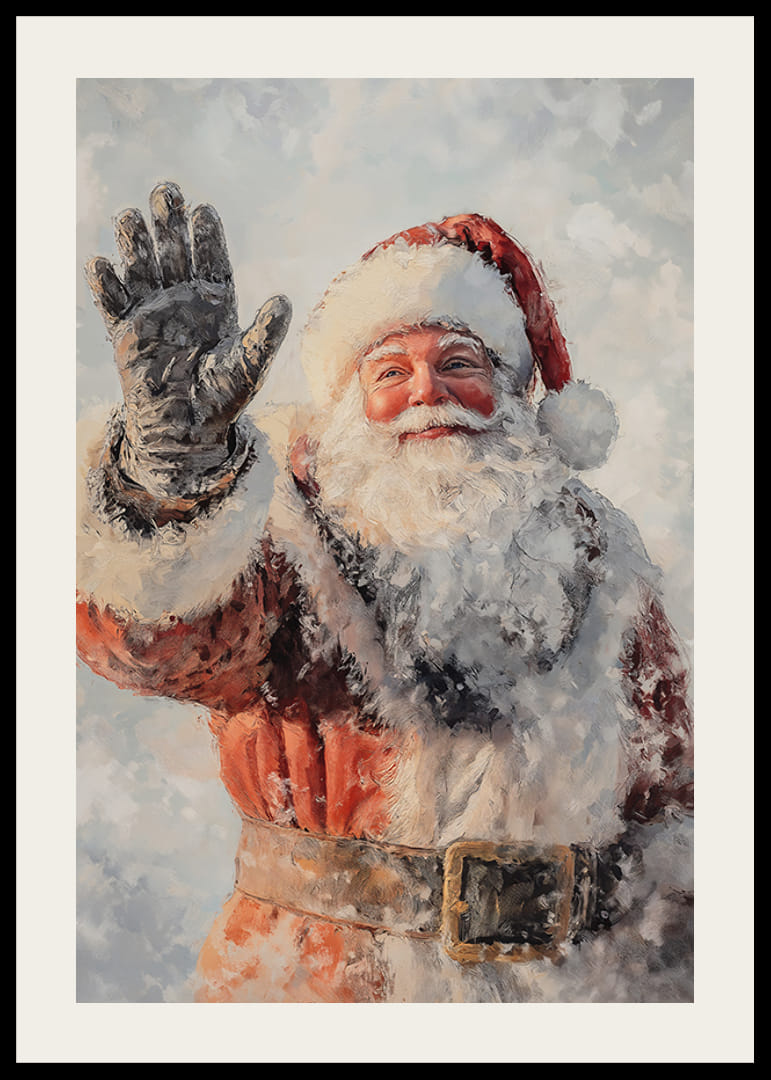 Spred julehygge i dit hjem med denne klassiske julemandsplakat! Billedet viser en smilende julemand, klædt i sin traditionelle røde kappe og snehvide skæg, der vinker muntert med et varmt og venligt blik. Hans glæde og charmerende udtryk fanger den ægte julefølelse og leder tankerne hen på barndommens magiske højtider. Perfekt til at skabe en indbydende og festlig stemning i hjemmet i julen.