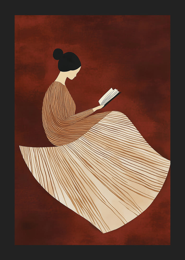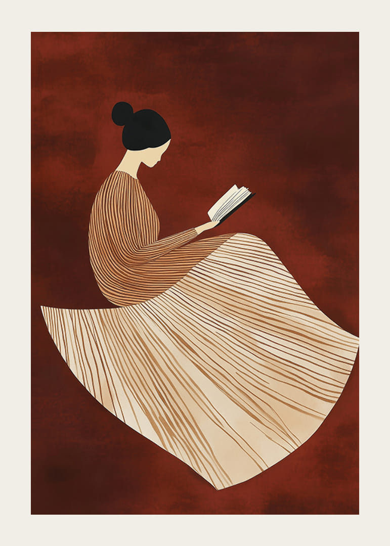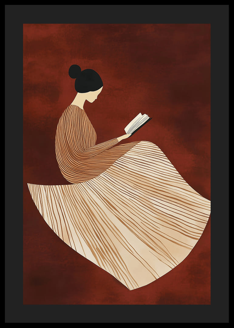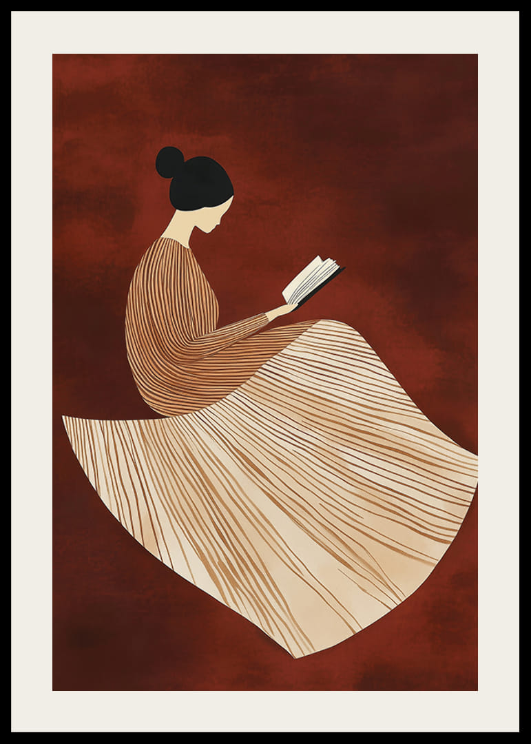 Denne smukke plakat viser en stiliseret figur i en elegant, linjemønstret kjole, dybt fordybet i en bog mod en varm, rødbrun baggrund. De bløde linjer og harmoniske farver skaber en følelse af ro og refleksion.
