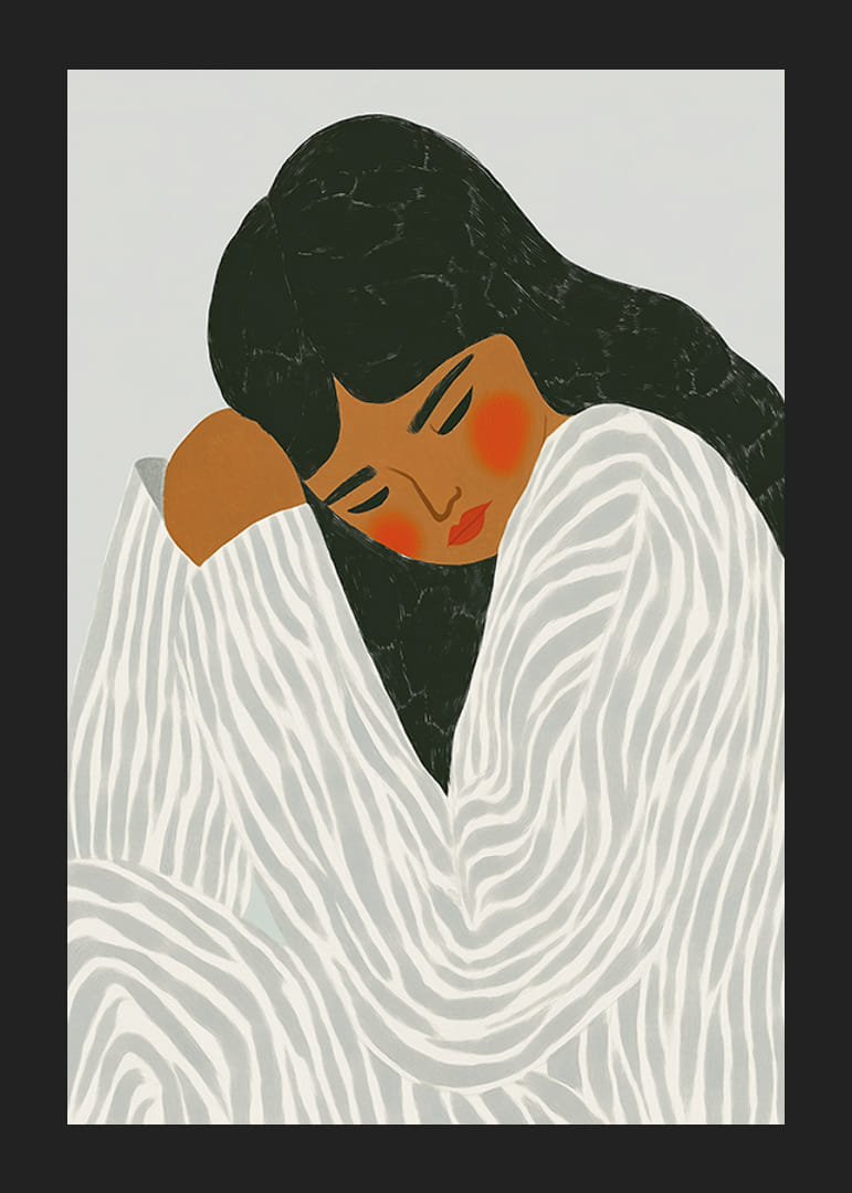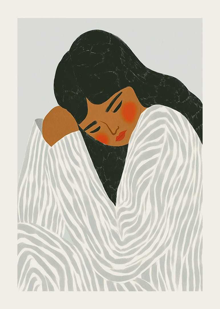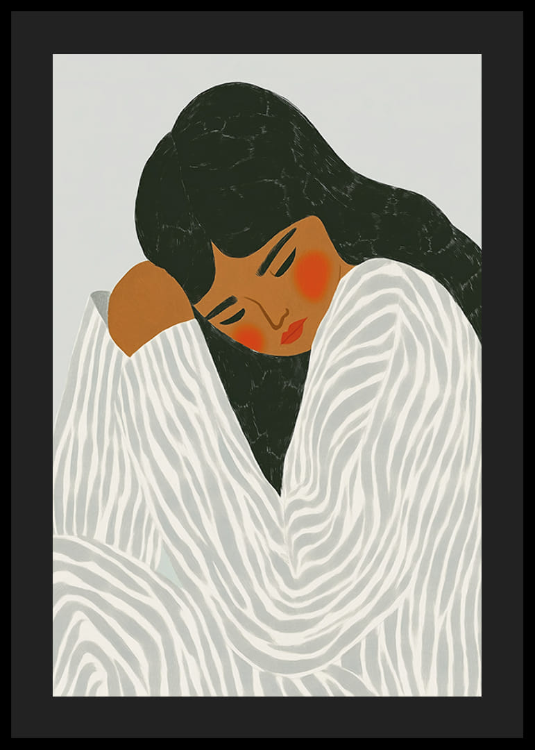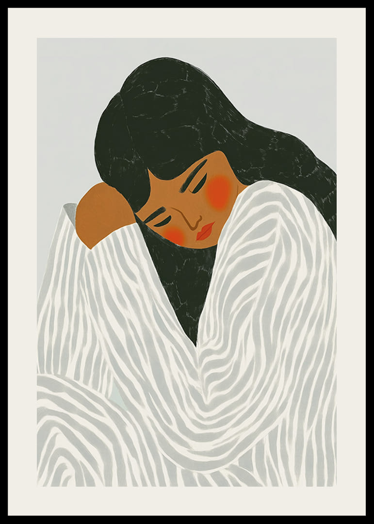 Giv din væg liv og følelser med denne fængslende plakat! En kvinde fanget i et øjebliks stilhed og introspektion, pakket ind i et blødt mønstret draperi, der fremhæver hendes dybe kontemplation.